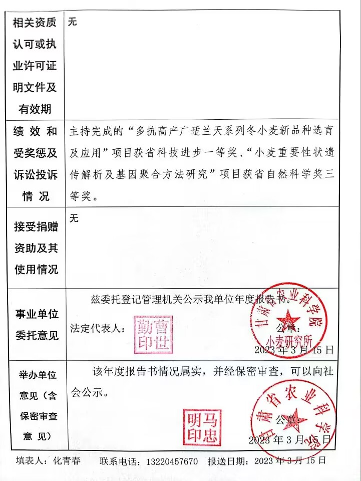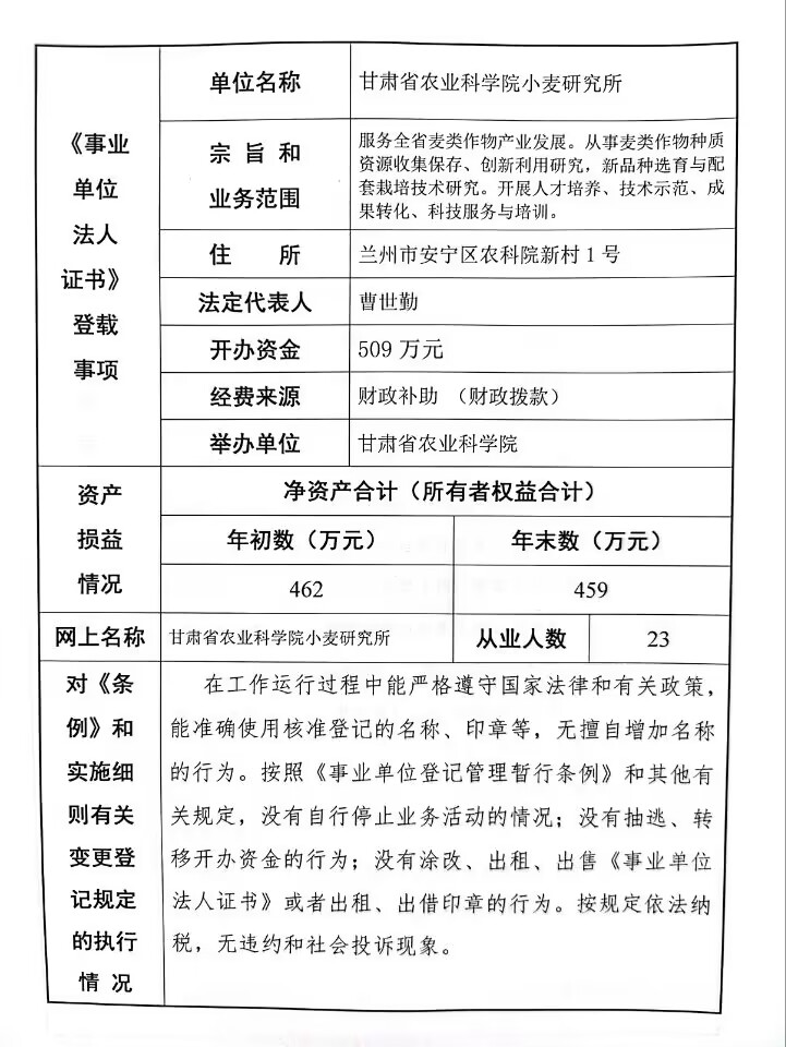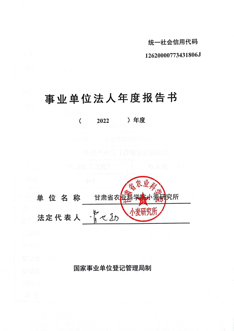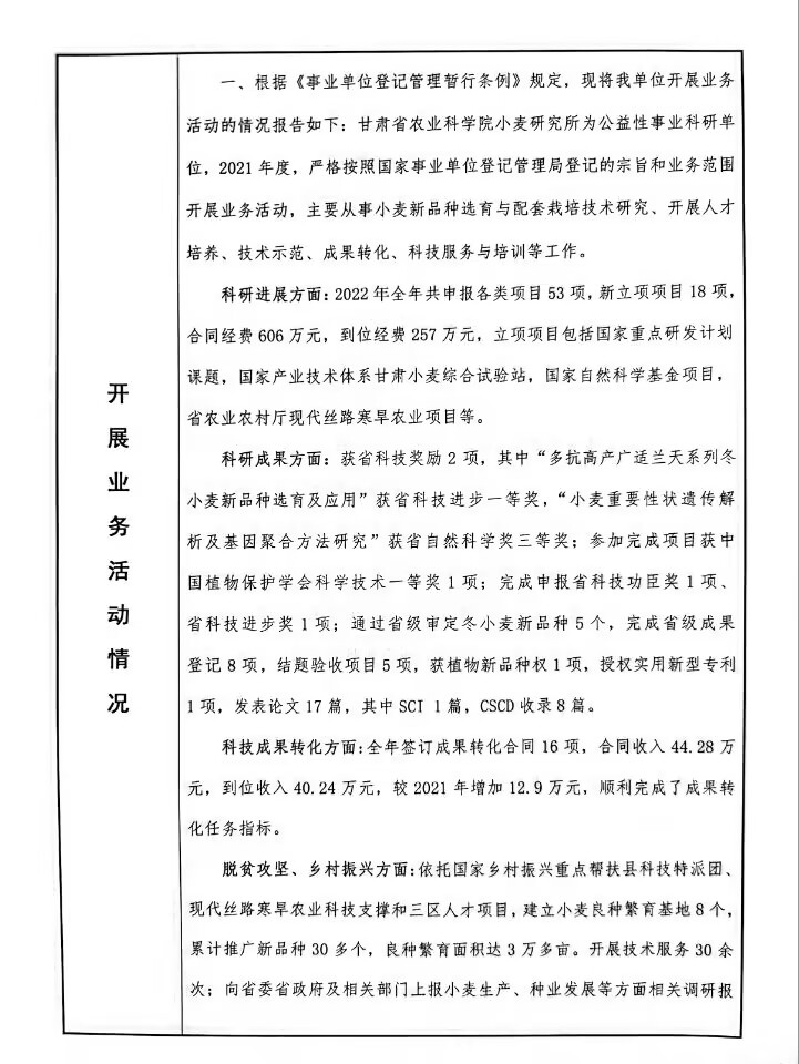 根据甘肃省事业单位登记局法人证书年检流程,现将我单位2022年度事业单位法人年度报告书在院局域网予以公示,对报告书填写内容的真实性给予监督。