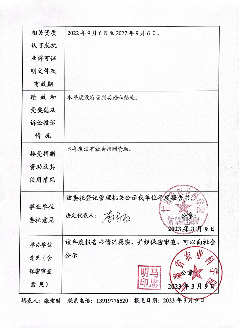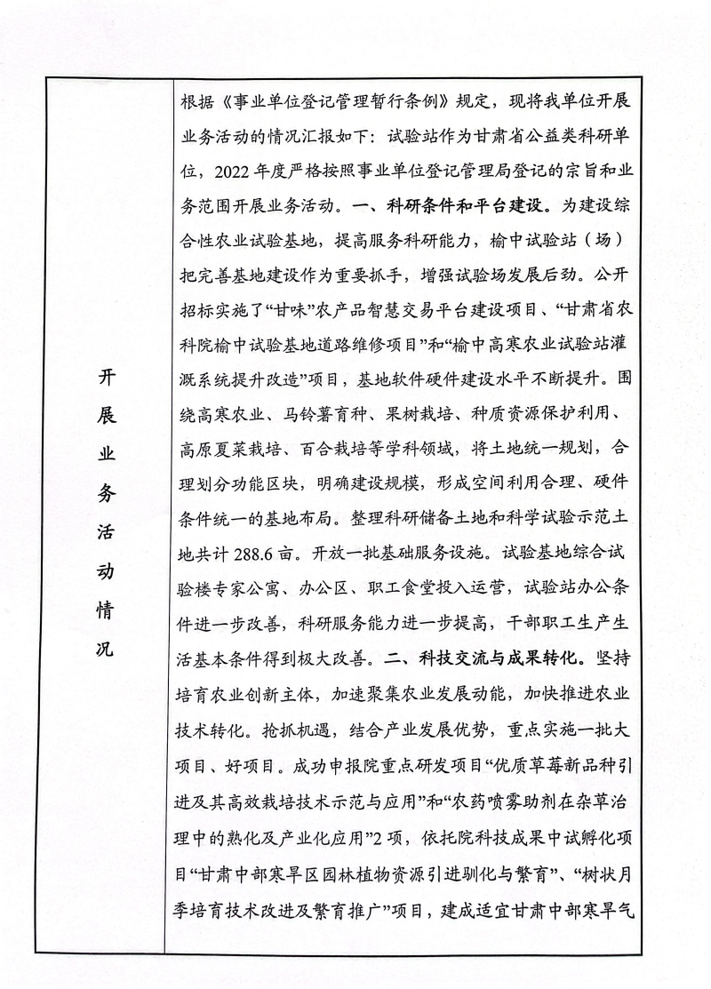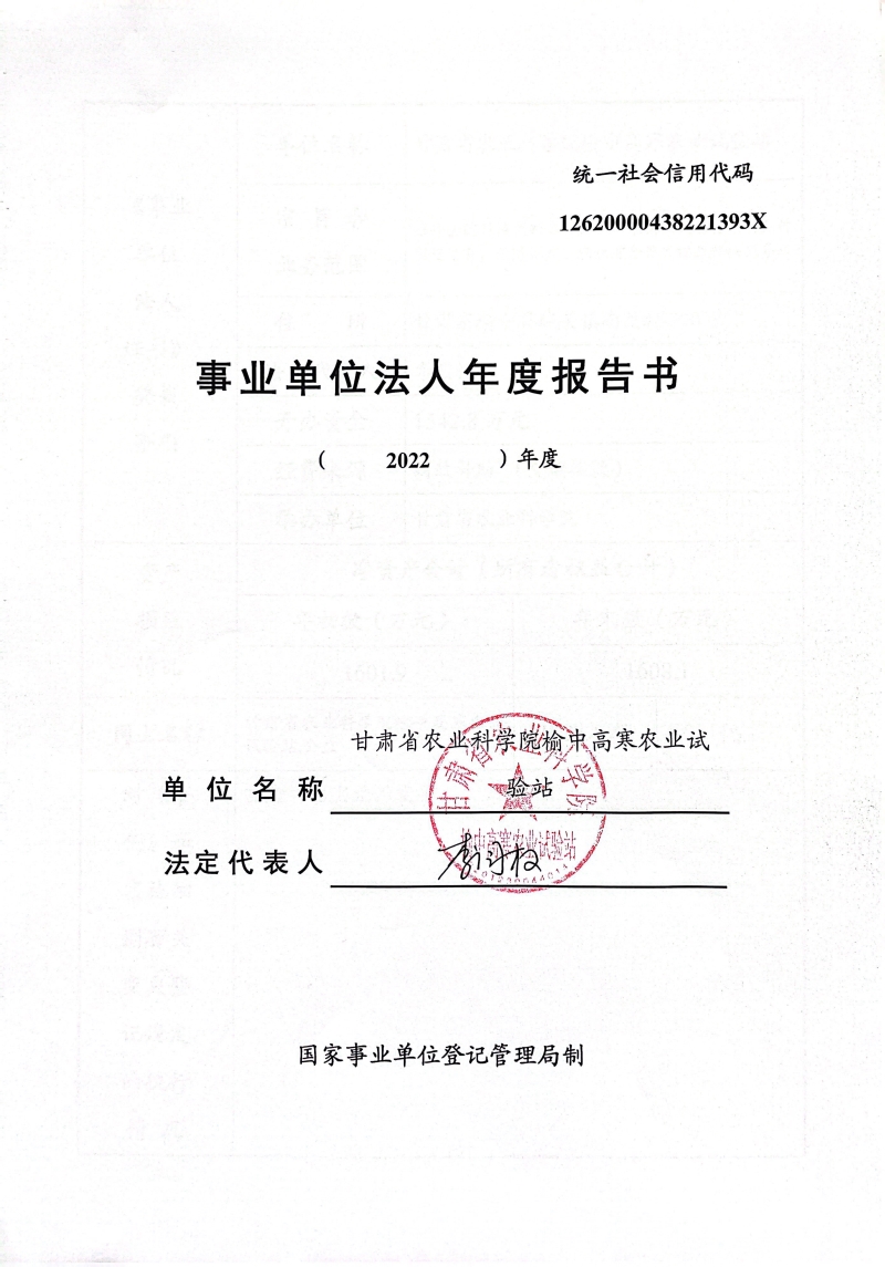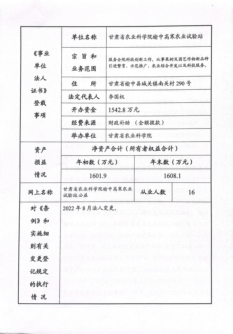 根据甘肃省事业单位登记局法人证书年检流程,我单位法人证书的年检报告书需在院局域网上进行公示,现将我单位2022年度事业单位法人年度报告书予以公示,对报告书填写内容的真实性给予监督。