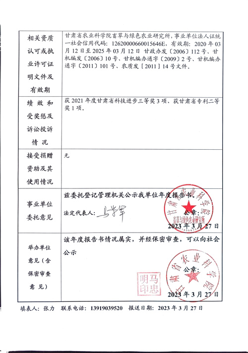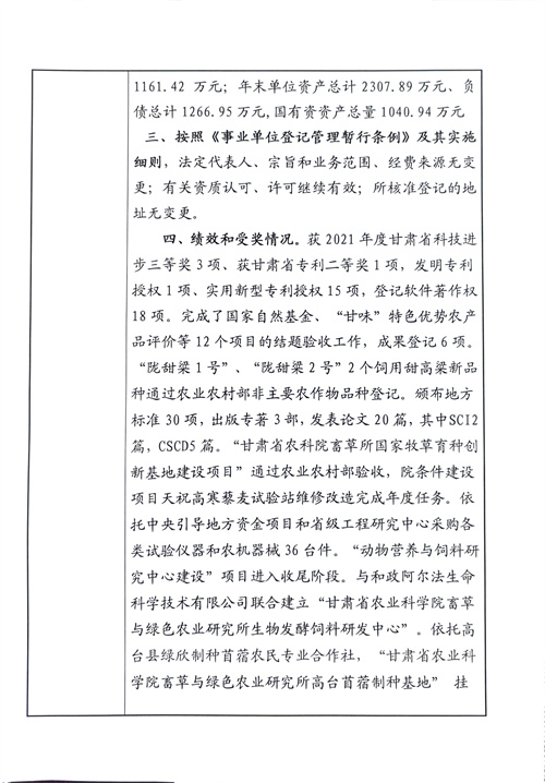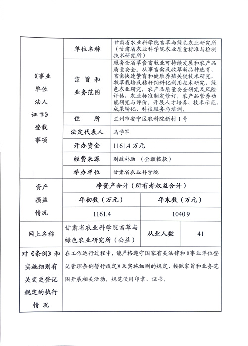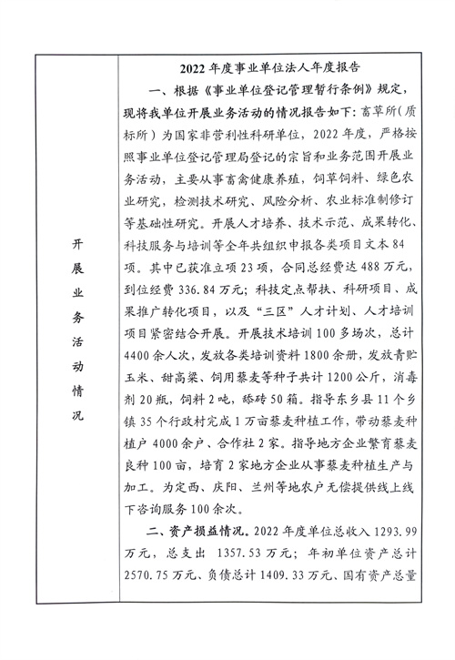 根据甘肃省事业单位登记局法人证书年检流程,现将我单位2022年度事业单位法人年度报告书在院局域网予以公示,对报告书填写内容的真实性给予监督。