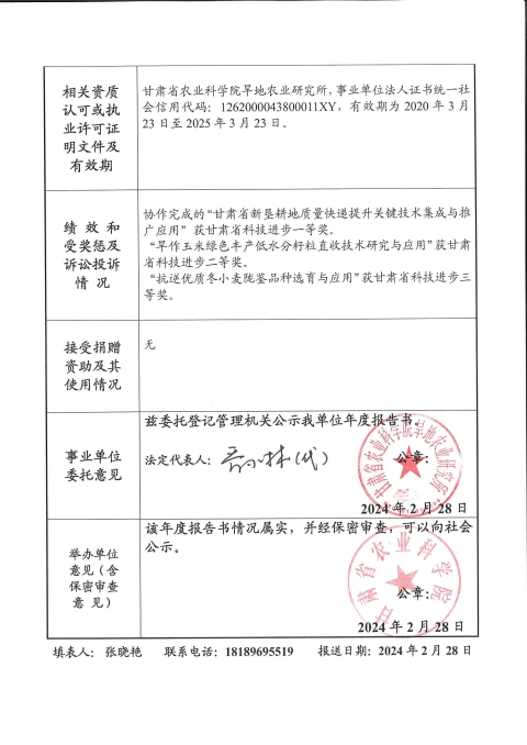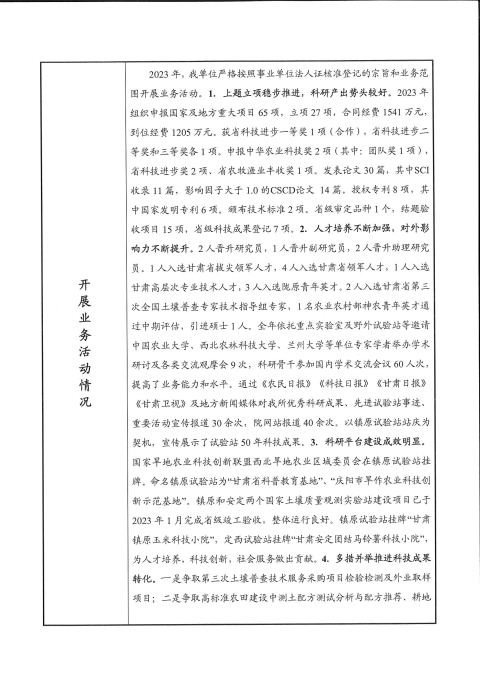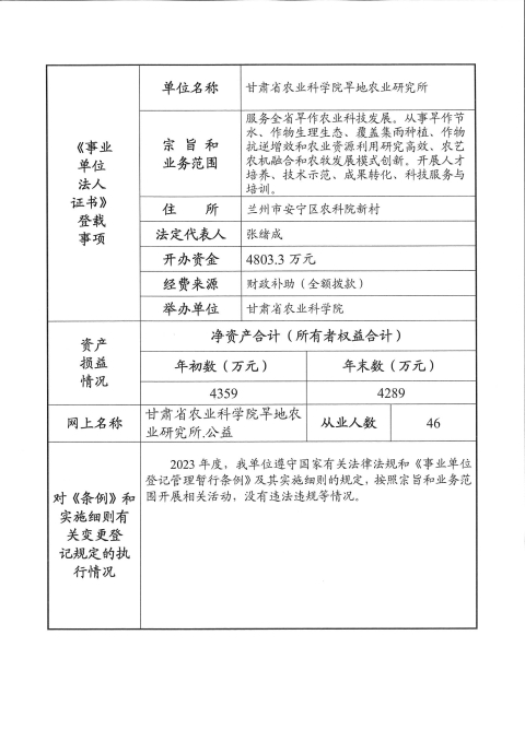根据甘肃省事业单位登记局法人证书年检流程,我单位法人证书的年检报告书需在院局域网上进行公示,现将我单位2023年度事业单位法人年度报告书予以公示,对报告书填写内容的真实性给予监督。