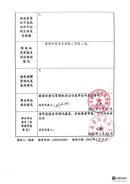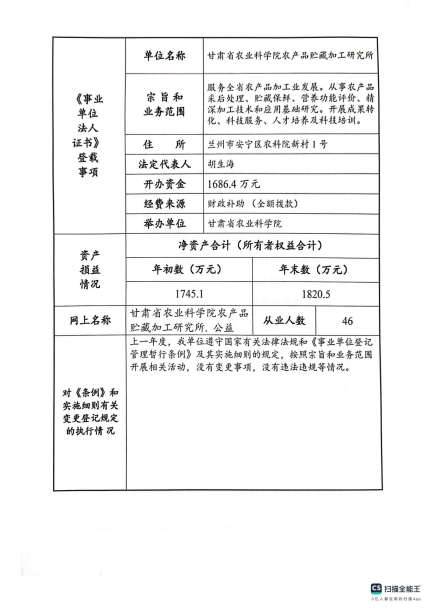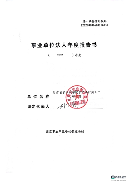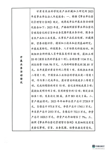 根据甘肃省事业单位登记局法人证书年检流程,我单位法人证书的年检报告书通过网上已提交甘肃省事业单位登记局审核通过,按流程需在院局域网上进行公示,现将我单位2023年度事业单位法人年度报告书予以公示,对报告书填写内容的真实性给予监督。