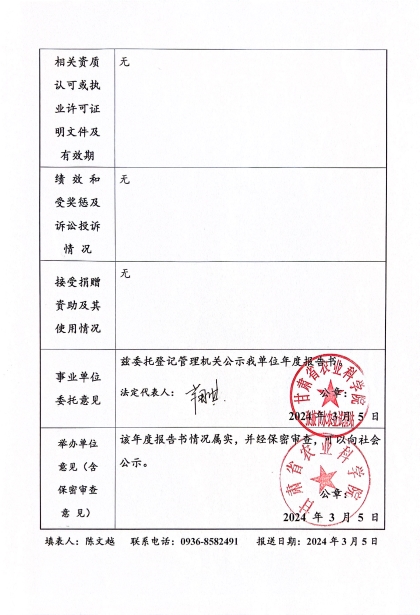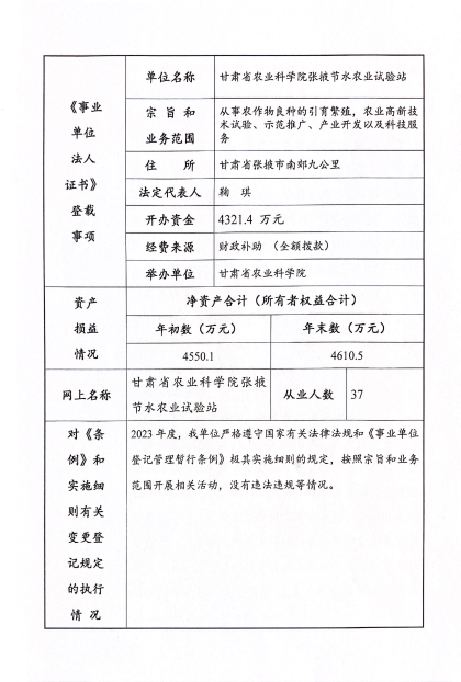 根据甘肃省事业单位登记局法人证书年检流程,我单位法人证书的年检报告书需在院局域网上进行公示,现将我单位2023年度事业单位法人年度报告书予以公示,对报告书填写内容的真实性给予监督。
