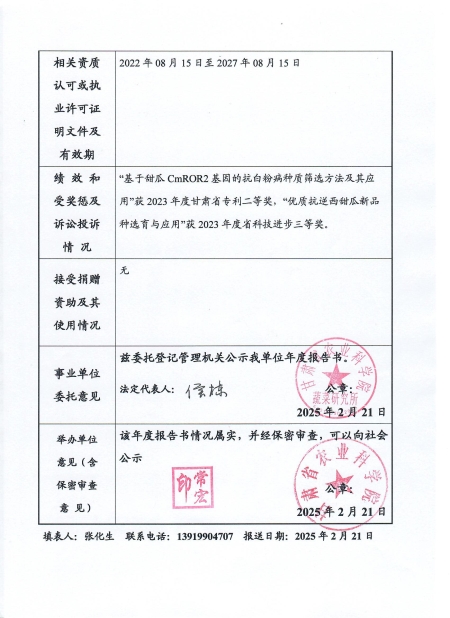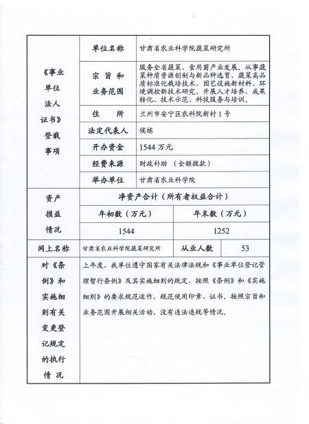 根据甘肃省事业单位登记局法人证书年检流程,现将我单位2024年度事业单位法人年度报告书在院局域网予以公示,对报告书填写内容的真实性给予监督。