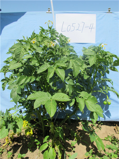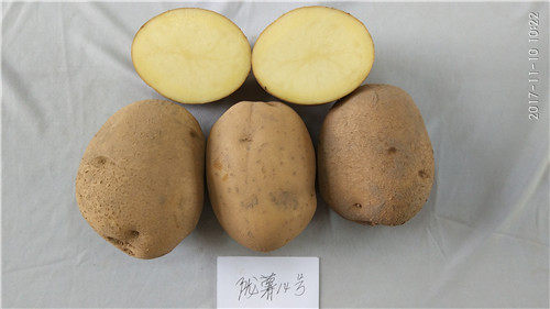 特征特性:晚熟,出苗后121天可收获。株型半直立,株高65cm左右,生长势较强,分枝数中等,茎绿色。复叶较大,叶缘平展;叶绿色,花冠白色;天然结实性强。匍匐茎短、结薯集中。块茎椭圆形,淡黄皮淡黄肉,表皮粗糙,较大而整齐,芽眼浅。煮食口感和风味好。薯块含干物质平均26.03%,最高达到31.20%(2015),淀粉平均20.26%,最高达到24.73%(2008),粗蛋平均2.63%,维生素C平均16.23mg/100g,还原糖平均0.20%。鲜薯食用、淀粉加工和全粉加工。植株高抗晚疫病,对卷叶病毒病具有较好的田间抗性。