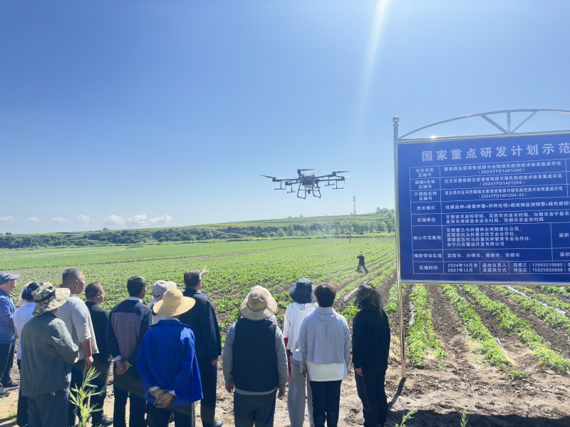 在渭源县五竹镇鹿鸣村示范基地,吕和平向与会人员详细介绍了课题的总体情况、任务目标、试验安排、阶段性进展以及示范基地建设和绿色防控示范情况。随后,子课题团队成员刘永刚研究员针对马铃薯大田生产上常见的晚疫病、早疫病、蚜虫、蛴螬等多发频发的病虫害,从抗病虫品种选择、病虫害识别防控及水肥高效管理等多个方面进行了细致讲解,为参会人员提供了丰富的理论知识。讲解结束后,与会人员现场观摩了晚疫病抗性鉴定试验、晚疫病抗性品种筛选试验及晚疫病飞防示范现场演示,直观地了解了各项试验的具体操作流程和防控效果。