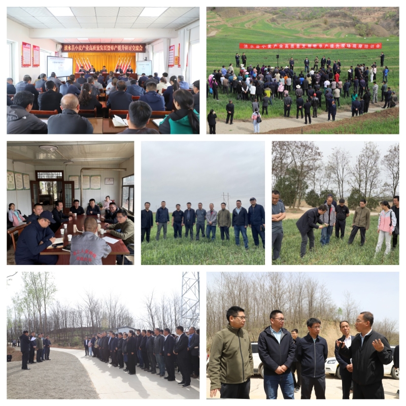 在王河镇东坪梁、西堡子梁、南湾梁小麦万亩良繁示范片,专家组调研小麦当前生长情况并进行现场技术指导,结合当地土壤条件、气候特点,围绕肥水管理、病虫害防控、栽培技术等关键维度,为种植户进行细致专业讲解与现场技术指导,手把手传授科学田间管理方法技巧。当日下午,在清水县王河镇,专家组参加了“清水县小麦产业高质量发展暨单产提升现场观摩培训会”。培训会由国家小麦产业技术体系天水综合试验站与清水小麦产业研究院联合举办,清水县委副书记董晓明到会指导并致辞,县直有关部门负责人及技术人员,兄弟乡镇分管领导,天水市种业龙头企业负责人和生产经营主体种植大户代表80余人参加。培训会上,王朝辉教授以《大面积单产提升技术——肥水管理》为题,深入剖析了肥水管理在提升小麦单产中的关键作用,详细讲解了不同生长阶段小麦对水分和肥料的需求特点以及科学的管理方法;马守田博士围绕《小麦需水规律与水肥一体化技术》,系统阐述了小麦生长过程中的需水规律,回顾了全国水肥一体化技术应用情况,分析了陇东南因地制宜发展水肥一体化的可行性、必要性和技术重点,为山旱地小麦大面积单产提升提供新思路。