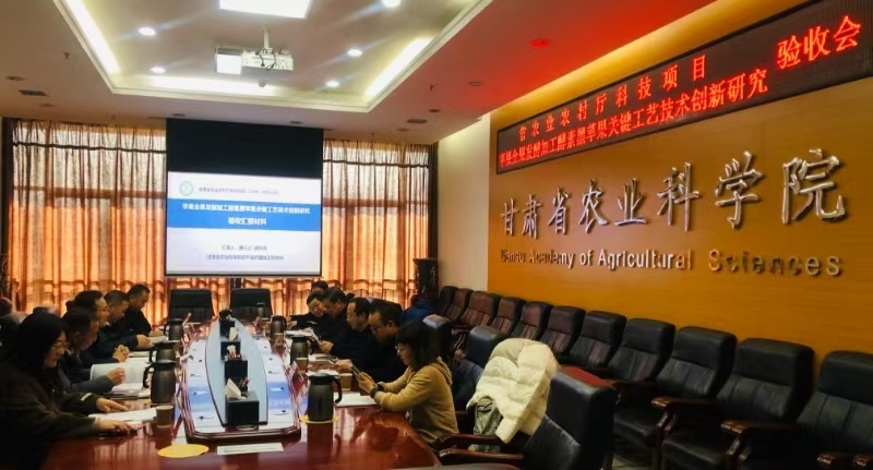 2024年12月6日,由甘肃省农业农村厅组织,邀请有关专家组成验收组,对我院农产品贮藏加工研究所承担的甘肃省农业农村厅科技项目“苹果全果发酵加工酵素黑苹果关键工艺技术创新研究”(GNKJ-2022-29)进行验收,会议由省农业农村厅科技合作处副处长张少明主持,验收专家组由甘肃省经济作物技术推广站李向东研究员、甘肃省商业科技研究所牛犇正高级工程师、甘肃农业大学贠建民教授、西北民族大学高丹丹教授、甘肃省科学院邵建宁研究员等专家组成,院科研管理处处长胡新元研究员、加工所党总支书记、所长胡生海,副所长王玉安及课题组成员20余人参加验收会。