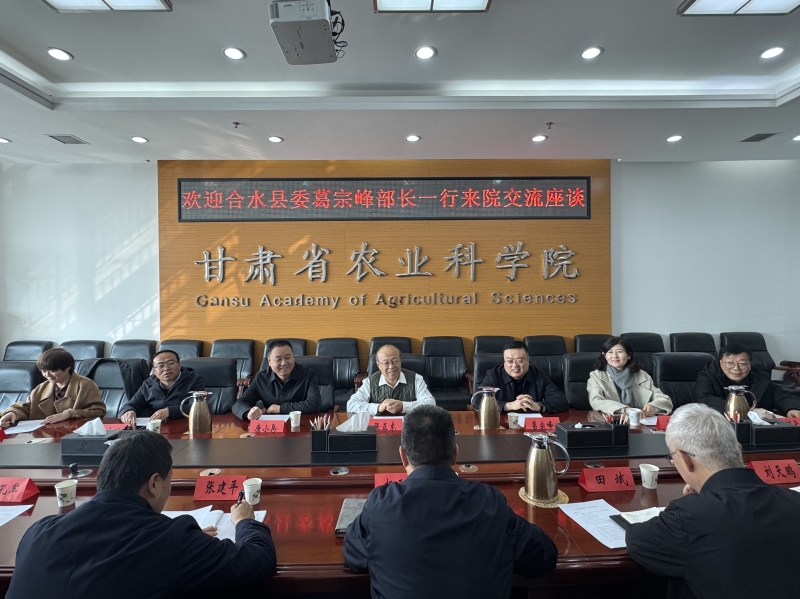 11月20日,庆阳市合水县县委常委、统战部部长葛宗峰、庆阳商贤联谊会副会长张正龙、山东甘鲁招商服务集团有限公司董事长姬长平一行7人来我院开展科技合作交流。院党委委员、副院长杨天育,成果转化处、作物所、林果所相关负责同志及科研人员参加座谈。