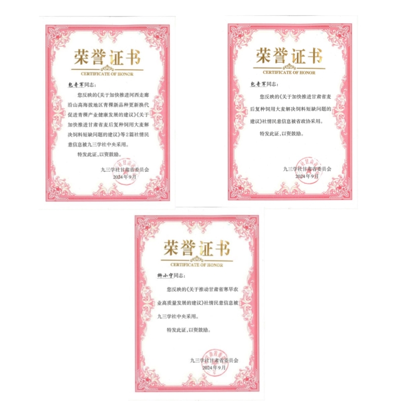其中支社社员包奇军提交的《关于加快推进河西走廊沿山高海拔地区青稞新品种更新换代,促进青稞产业健康发展的建议》《关于加快推进甘肃省麦后复种饲用大麦、解决我省养殖饲料短缺问题的建议》;柳小宁提交的《关于推动甘肃省寒旱农业高质量发展的建议》三篇社情民意被九三学社社中央采用;包奇军提交的《关于加快推进甘肃省麦后复种饲用大麦、解决我省养殖饲料短缺问题的建议》被省政协采用。这些建议的采纳,标志着我院九三学社社员在推动地方经济和农业发展方面的意见建议得到了上级组织的认可,也为今后的工作指明了方向。