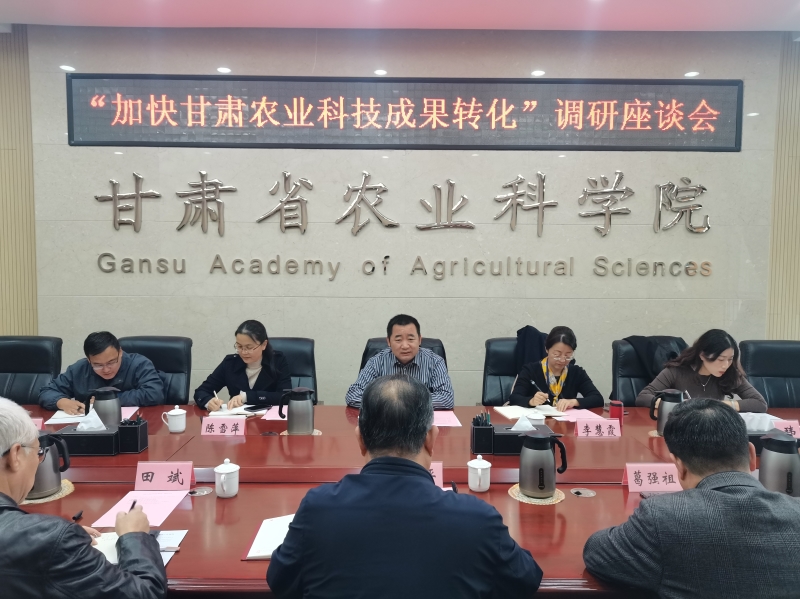 11月2日,省政协常委、民盟甘肃省委员会副主任、中国农科院兰州兽医研究所所长助理付宝权研究员一行5人来我院调研科技成果转化工作。院党委委员、副院长吕和平主持调研座谈会。院科技成果转化处、马铃薯研究所、植物保护研究所、土壤肥料与节水农业研究所负责人参加座谈。