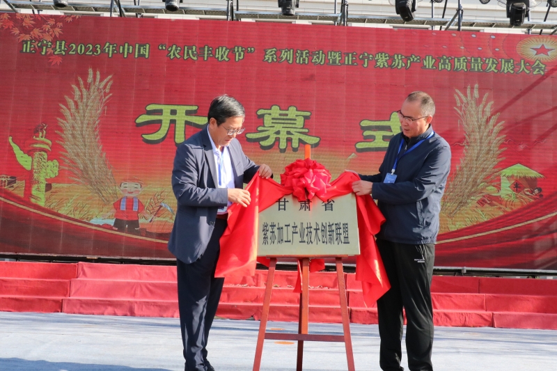 院党委委员、副院长吕和平和庆阳市政府副市长史建芳为“甘肃省农业科学研究院(正宁)紫苏产业技术研究院”揭牌,省工信厅一级调研员高东阳与金牛实业有限责任公司董事长路芳民为“甘肃省紫苏加工产业技术创新联盟”揭牌,正宁县委书记王光龙主持开幕式,副院长吕和平和正宁县委副书记、县长程跟会致开幕辞。