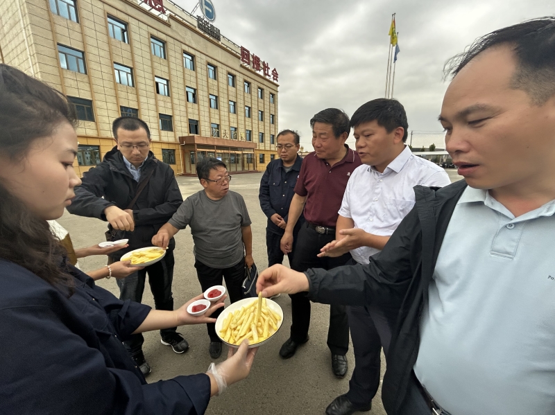 胡宏海、李小波等专家赴东乡县达板镇经济开发区,参观了甘肃方大百泉农业科技有限公司薯条加工厂,考察薯条加工设备设置等全部流程,重点观察切条规范程度,清洗、干燥分级、油炸等设备运行流畅状况,薯条产出率与质量等指标,就生产中存在问题探讨了解决途径与办法。赴马铃薯研究所榆中试验站考察了现有加工型新品系及筛选加工型新品系的加工测试设备,并对加工流程进行了详细询问,针对提高筛选效率及准确度,进行了现场指导。