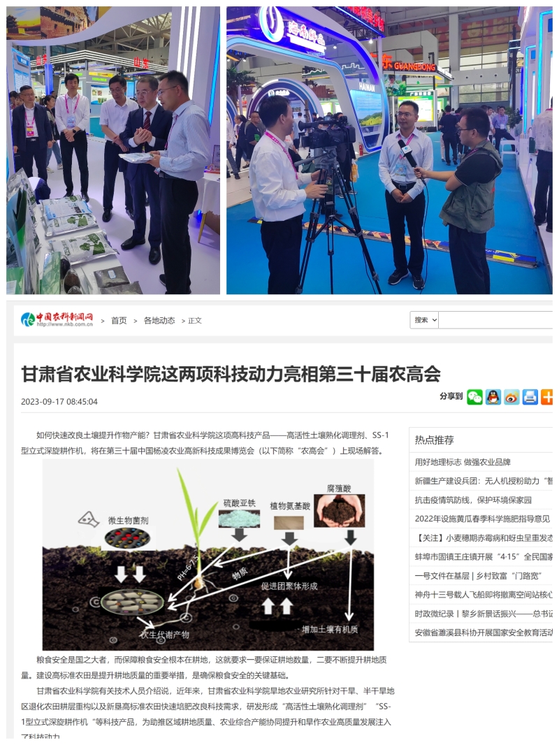 2023年9月19-23日,第三十届中国杨凌农高会在陕西杨凌农业高新技术产业示范区举办,本届农高会由科技部、商务部、农业农村部、国家林草局、国家知识产权局、中国科学院和陕西省人民政府共同主办。大会以“科技创新引领农业高质量发展”为主题,重点关注“土壤健康与粮食安全”,共组织农业高新技术成果展、农业科技示范推广应用展、国际农业交流合作展、国际农业智能装备展、农业中小企业展、农业特色产品展、农业技术田间推广展、云上体验展等方面的展览展示,共有来自50个国家和地区的8000多项农业高新科技成果集中亮相本届农高会。我院旱农所研发的“SS-1型立式深旋耕作机”、“高活性土壤熟化调理剂”、“旱作玉米密植增产全程机械化种植体系”等三项科技成果进行了参展,受到各界广泛关注,并在展会期间接受农业科技报·中国农科新闻网专访。通过本次参展进一步提升了优秀科技成果的宣传展示力度,促进了科技成果的转化和产业化。