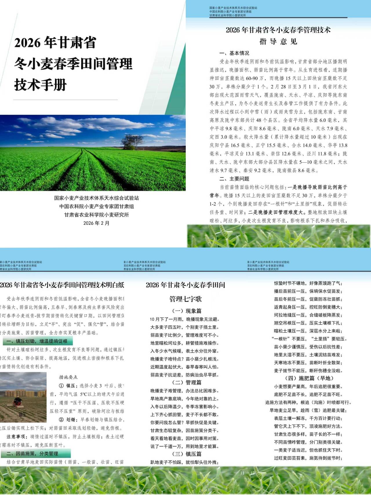 惊蛰过后,陇原大地气温逐渐回升,冬小麦由南至北陆续进入返青生长的关键窗口期。受2025年秋季连阴雨和冬前低温天气影响,甘肃省部分麦田播期推迟,冬小麦冬前生长发育不足,苗情整体呈现“正常偏弱”态势,一、二类苗占比同比下降,存在弱苗比例大、根小苗弱蘖少等问题。针对这一情况,小麦所组织专家团队聚焦“促弱转壮增群”核心目标,及时编制了《2026年甘肃省冬小麦春季田间管理技术》《明白纸》《七字歌》等技术方案,为春季田间管理提供精准指引。