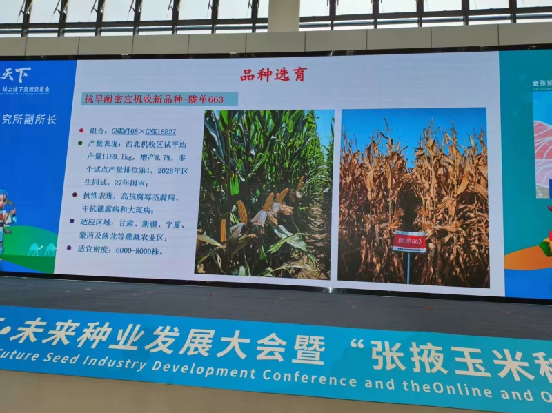 会上,周玉乾研究员作了题为《创新育种技术,培育突破品种,助力玉米单产提升》的报告。报告从西北玉米生产概况、西北玉米生产问题分析、育种技术创新、品种选育四个方面介绍了我院玉米育种创新情况,重点推介了我院选育的陇单635、陇单663(抗旱耐密宜机收)及陇单662(抗旱粮饲兼用)等玉米新品种。 国家玉米良种攻关专家组秘书长、中国农科院研究员王天宇在大会主旨演讲中,对我院周玉乾团队在耐旱玉米新品种选育方面的工作给予了高度评价。其间,参会人员与湖北康农、甘肃亚盛等玉米制种企业负责人进行了广泛交流。
