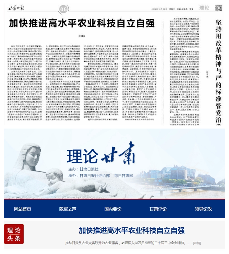 2024年10月29日,甘肃日报理论版头条、每日甘肃网理论栏目头条刊发我院党委书记刘国汉署名文章《加快推进高水平农业科技自立自强》,全文内容如下: