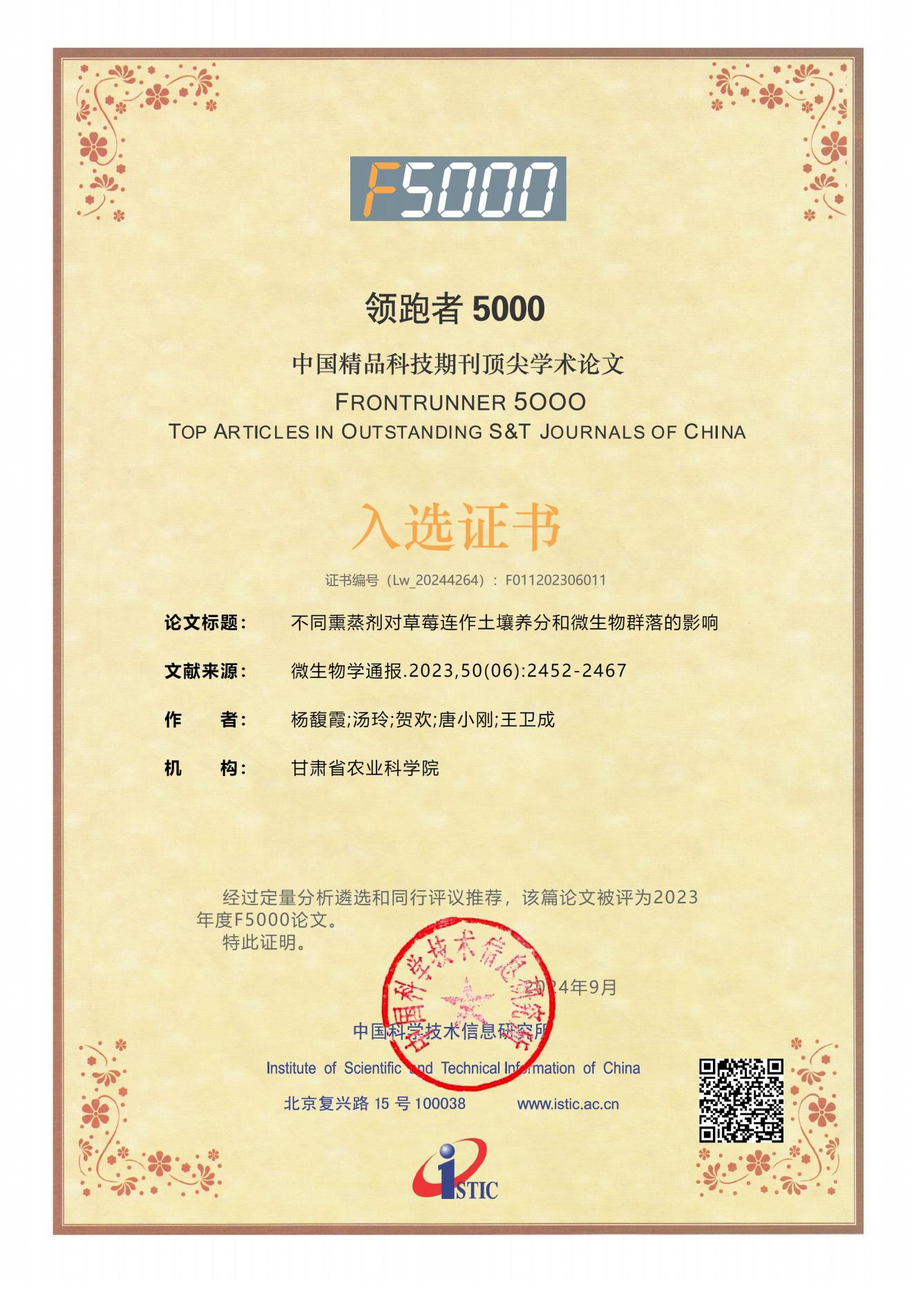 12月27日,我院林果花卉研究所发表于《微生物学通报》2023年第50卷第6期的论文“不同熏蒸剂对草莓连作土壤养分和微生物群落的影响”,被中国科学技术信息研究所评为2023年度“F5000(领跑者5000)中国精品科技期刊顶尖学术论文”。