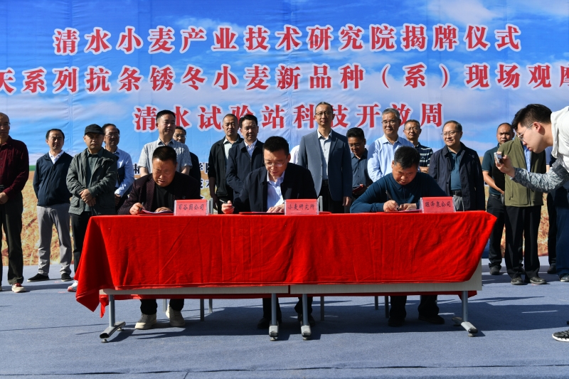 本次活动旨在展示清水试验站在小麦种质资源引进、创新利用、新品种选育、分子育种技术及条锈病持续控制方面的最新成果,加快科技成果转化,为助力乡村振兴,保障粮食安全提供科技支撑。活动期间,小麦研究所分别与甘肃百谷园农业科技有限公司、天水旺泽泉种业有限公司签订了2项小麦品种经营权转化协议。与会代表在清水试验站泰山庙塬育种试验基地、义坊村菊花塬示范基地观摩了以兰天36号、兰天42号、兰天45号、兰天575、兰天653、兰航选151、兰航选L622等为代表的兰天系列冬小麦新品种(系)田间的抗病性和丰产性,了解了基于分子生物学的分子标记开发、基因聚合、航天诱变等技术与常规育种技术相结合的新品种选育成效。