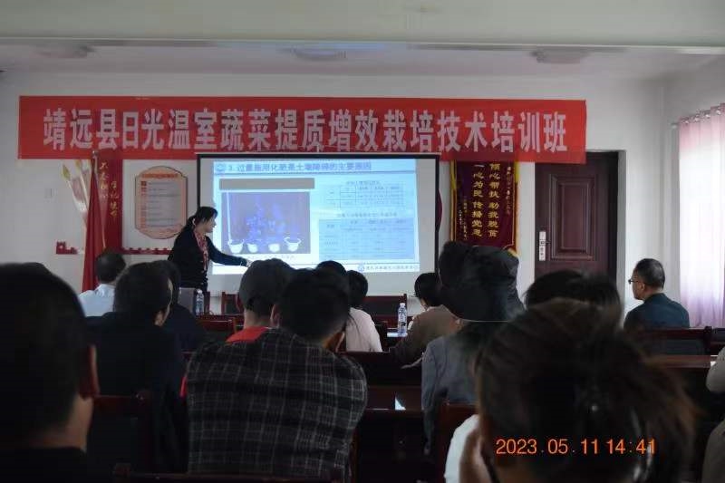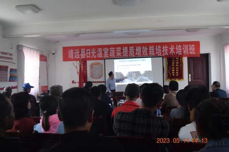 11日下午,参会人员赴东湾镇大坝园区、北湾镇新坪村、北湾镇中堡村考察调研,深入甘肃陇豫润鑫农业发展有限公司日光温室查看了温室的建造、蔬菜育苗及生产状况,与企业技术人员就课题实施的指标进行了探讨和交流,课题组就日光温室蔬菜优质抗逆品种筛选、绿色标准化种植、机械化生产、自动化管理技术等年度任务计划进行了落实与部署。沈阳农业大学孙周平教授、刘玉凤教授分别做了题为“日光温室蔬菜轻简化与机械化生产技术”、“设施蔬菜土壤障碍与化肥减施”的培训。