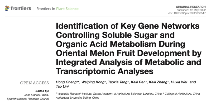 近日,蔬菜研究所甜瓜分子育种团队和中国农业大学园艺学院合作,在Frontiers in Plant Science期刊(IF5.753/Q1)在线发表了题为“Identification of Key Gene Networks Controlling Soluble Sugar and Organic Acid Metabolism During Oriental Melon Fruit Development by Integrated Analysis of Metabolic and Transcriptomic Analyses”的研究论文,解析了甜瓜成熟过程中的糖酸代谢物和基因调控网络。