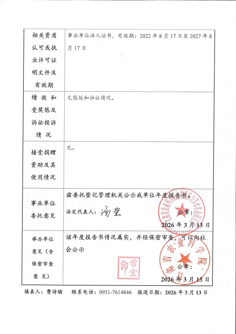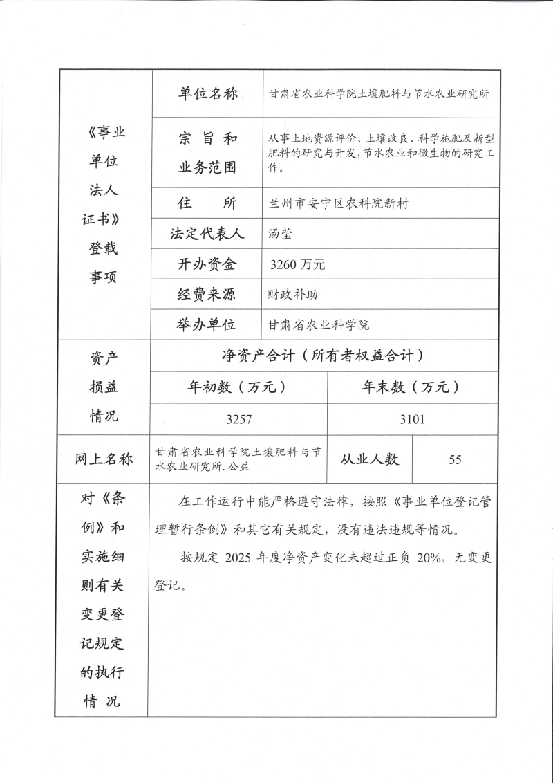 根据甘肃省事业单位登记局法人证书年检流程,现将我单位2025年度事业单位法人年度报告书予以公示,对报告书填写内容的真实性给予监督。